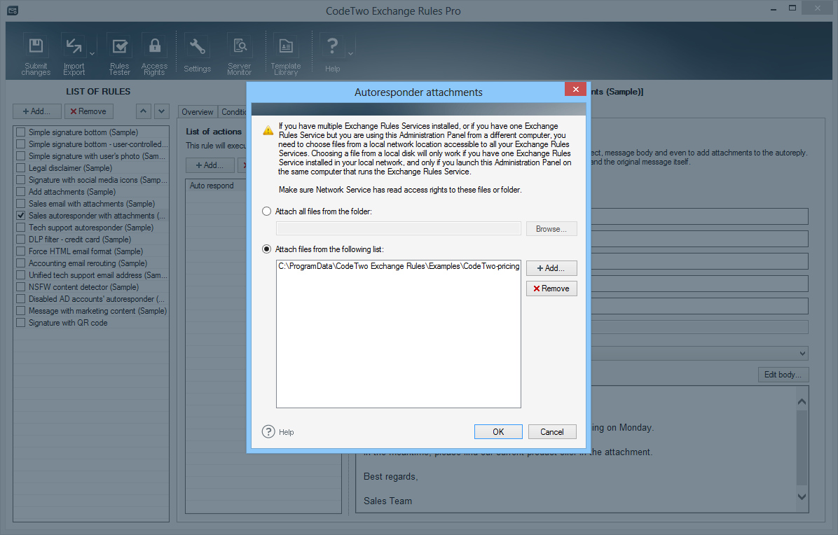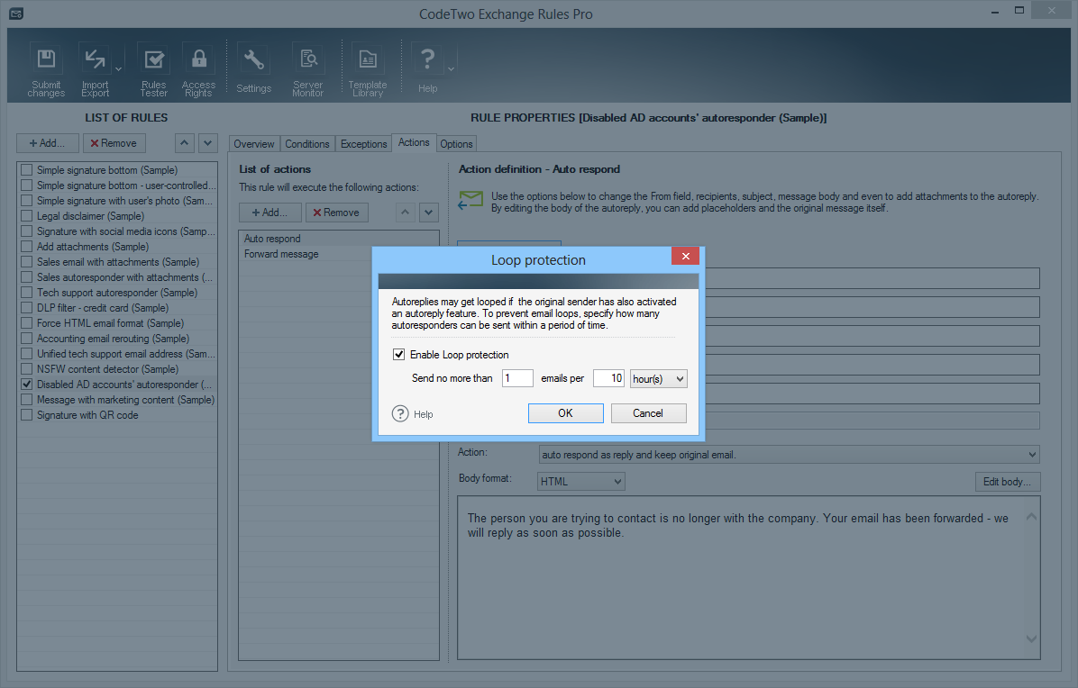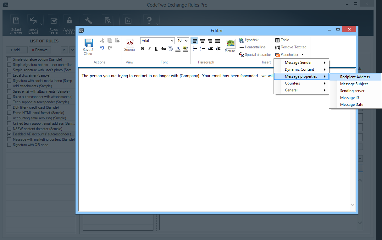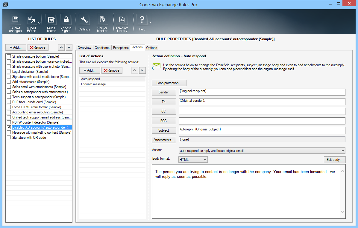 CodeTwo Exchange Rules Pro overcomes these limitations, giving you fully customizable and centrally managed auto-replies that can be used in many different scenarios. You can, for example, send automatic replies from your Sales team, Customer Support notifications, or messages informing about inactive email addresses. Furthermore, your automatic replies, including out of office messages, can look just like ordinary emails – they can contain images, the original message under the reply, email signatures and even attachments.