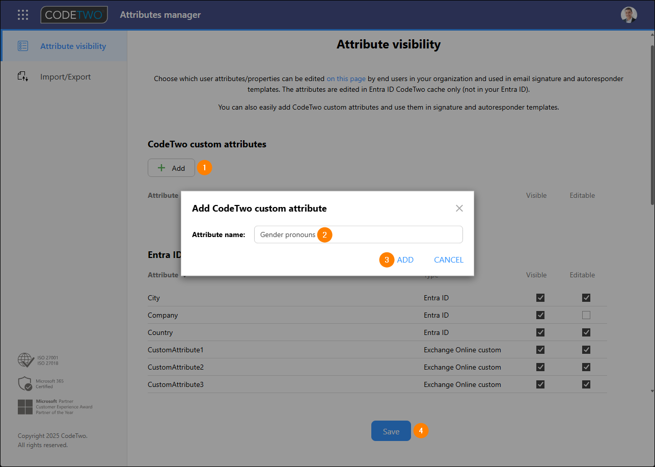 To create a new custom attribute, first click the Add button in the CodeTwo custom attributes section. In the window that opens, type the name of your attribute and click ADD. To apply the change, click Save (Fig. 3.).