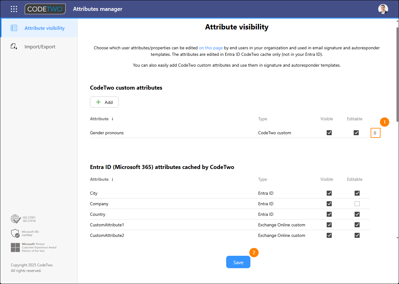 Which attributes end users see or can edit depends on the settings configured by an admin in Attributes manager (attributes.codetwo.com), as explained in this section.