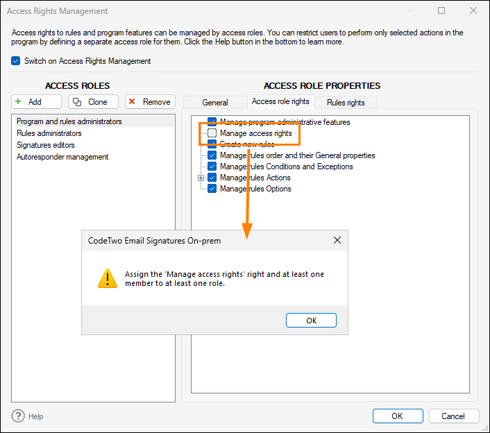 To avoid situations in which your organization is locked out of the software, at least one user must be assigned to an access role that holds the Manage access rights permissions. If you try to revoke Manage access rights for all access roles or delete all roles that hold these permissions, the software stops you by displaying a warning (Fig. 5.).