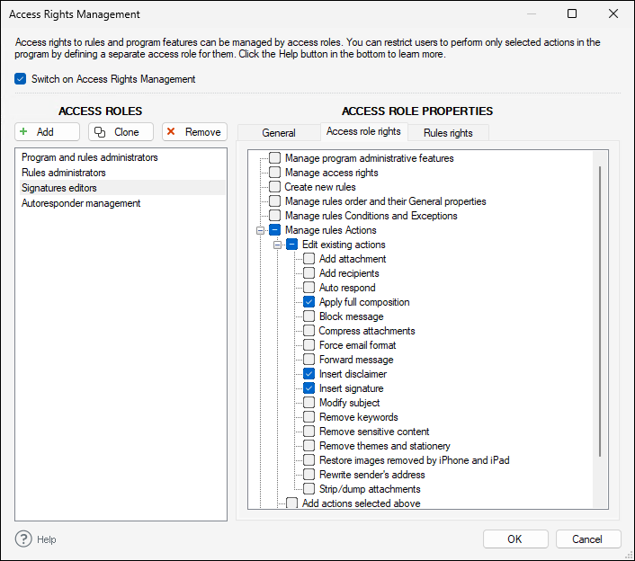 - Access role rights: here, you can manage access to the program's features, email rule types, and actions. Learn more about Access role rights