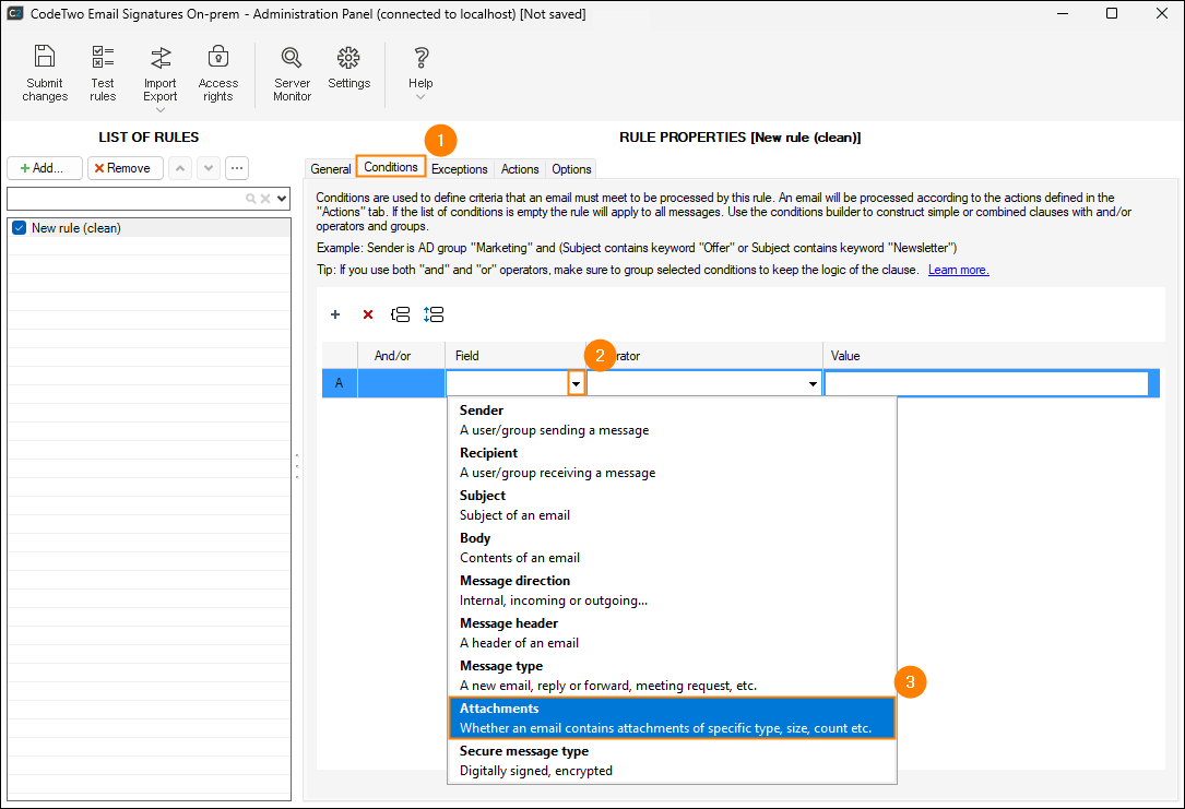 Fig. 1. Choosing Attachments on the Conditions tab.