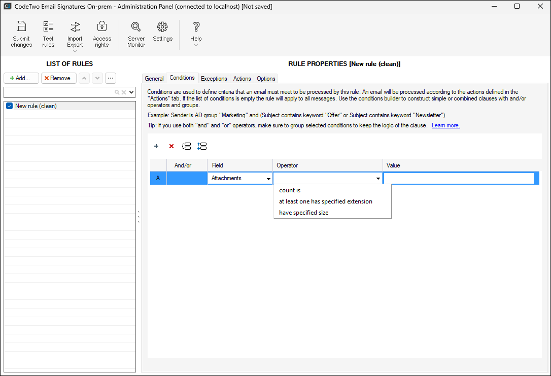 The Attachments condition is used within a rule to specify the count/size/extension of attachments that, once met, will trigger the program to process the rule and perform the associated action(s).