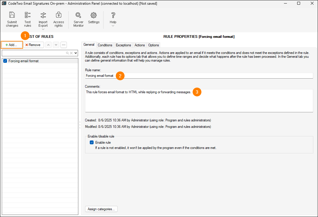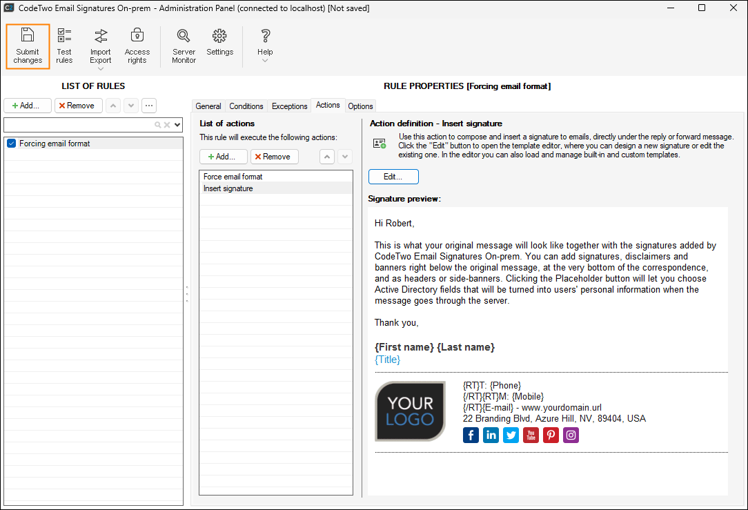 To configure the program to force the email format of all emails sent or received by your organization, you need to add a new rule in the following configuration: