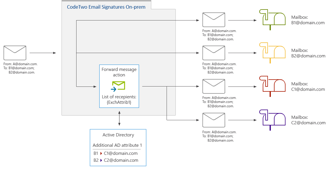 - User B2@domain.com has Additional AD attribute 1 in AD set to C2@domain.com.