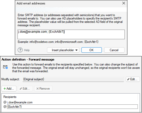 Once you decide to use placeholders the program will search through the original message recipients' accounts in the Active Directory database to check if they have an email address filled in the attribute specified by this placeholder. If the email address is found, then the original message will be forwarded to this address.