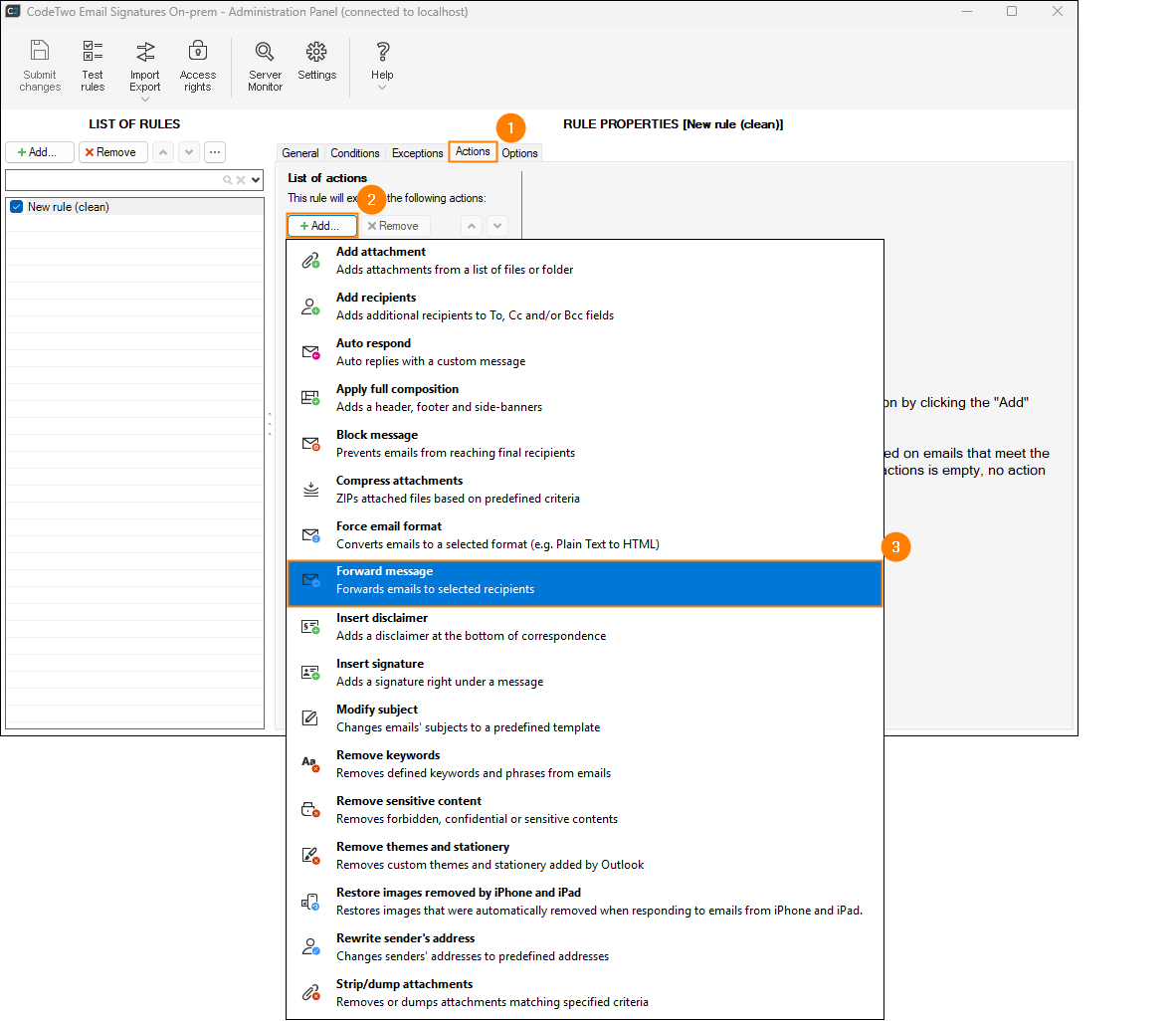 To activate this action in a given rule, go to the Actions tab, click Add and choose Forward message from the menu (Fig. 1.).
