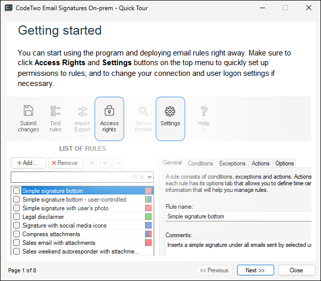 Once the installation of the software is finished, CodeTwo Email Signatures On-prem starts automatically. When the Administration Panel opens, it displays the Quick Tour slides (Fig. 1.) to help you learn about the main features of the program.