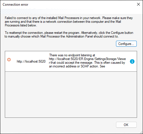 This error might appear if the Administration Panel is installed on a machine from a subdomain and tries to connect to the CodeTwo Mail Processor hosted on a machine from the primary domain. To resolve this issue, you need to configure the service connection manually. Click Configure in the error window. This opens the Connection tab of the program's settings. Select the Connect to the CodeTwo Mail Processor hosted on this Exchange Server option, provide the name or IP address of the server hosting the CodeTwo Mail Processor (Fig. 3.), and click OK. Restart the Administration Panel and the connection should be established.
