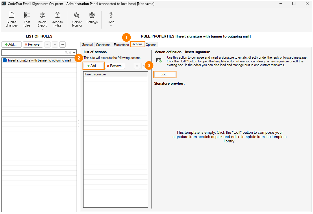 Move to the Actions tab, click Add and choose Insert signature from the list. After the action is added to the list of actions, click Edit (Fig. 4.) to open the template editor and compose your signature template including the marketing banner (Fig. 5.).