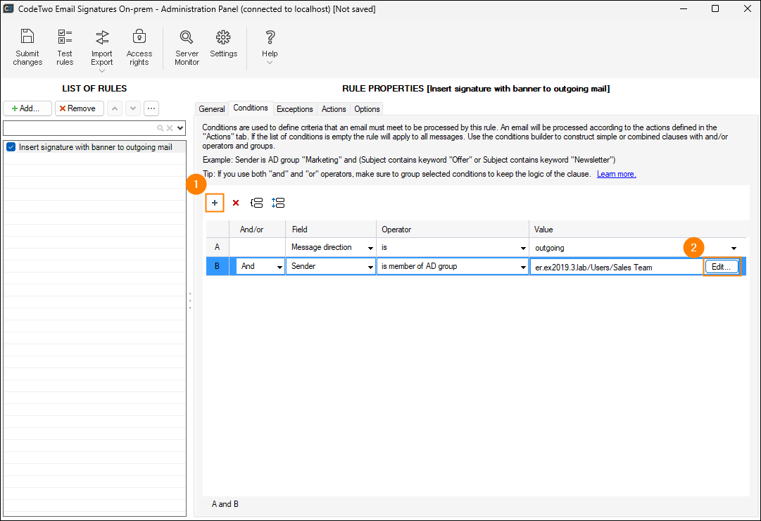 Next, add a second condition by clicking the + button. Configure the new row in the following way: Sender is member of AD group. In the next step, click Edit and choose a group whose members will be encompassed by the rule (Fig. 3.).