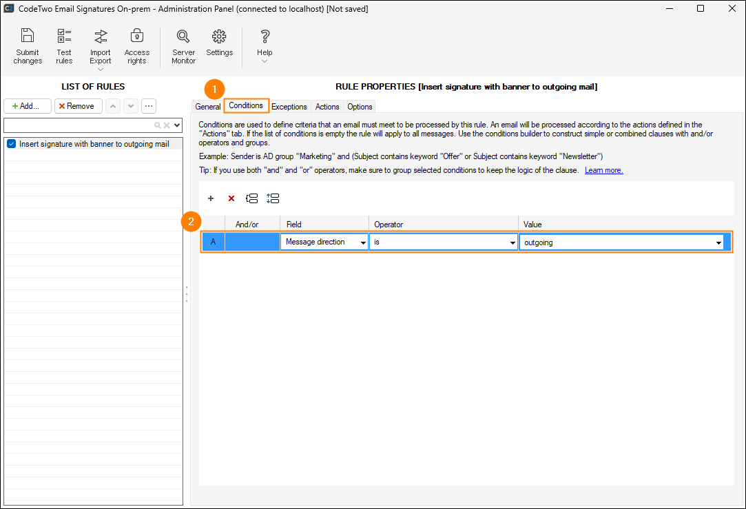 Go to the Conditions tab and select Message direction is outgoing (Fig. 2.).