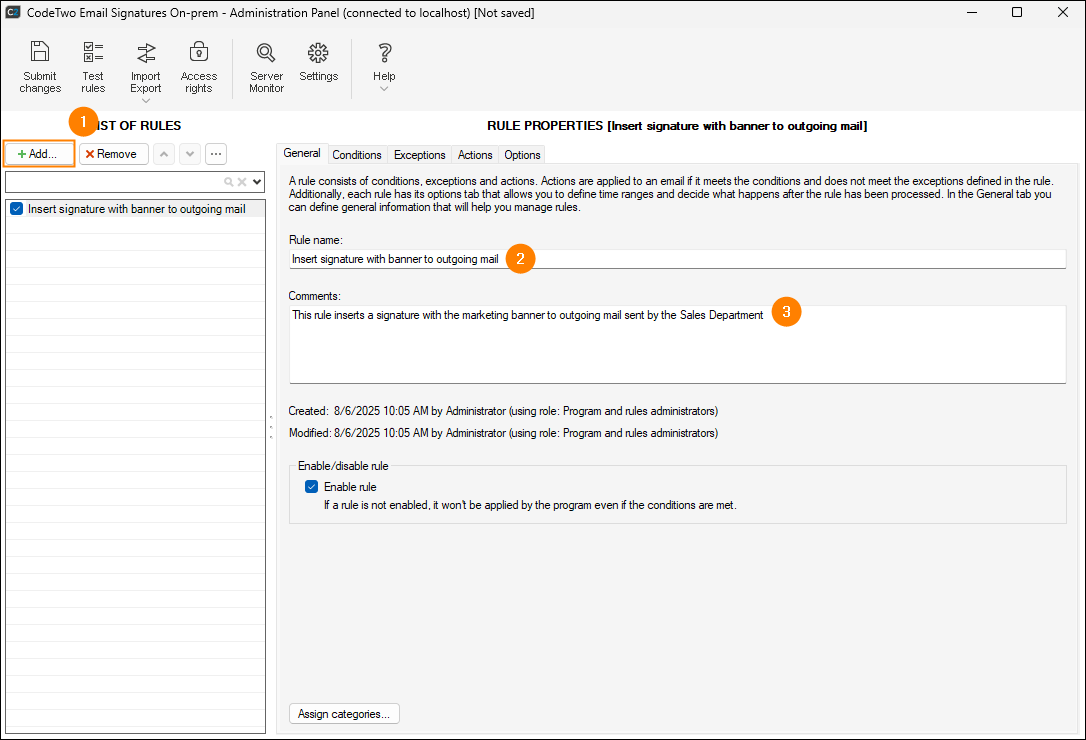 Add a new rule to the list of rules using the + Add button. Name your rule and describe it (Fig. 1.).