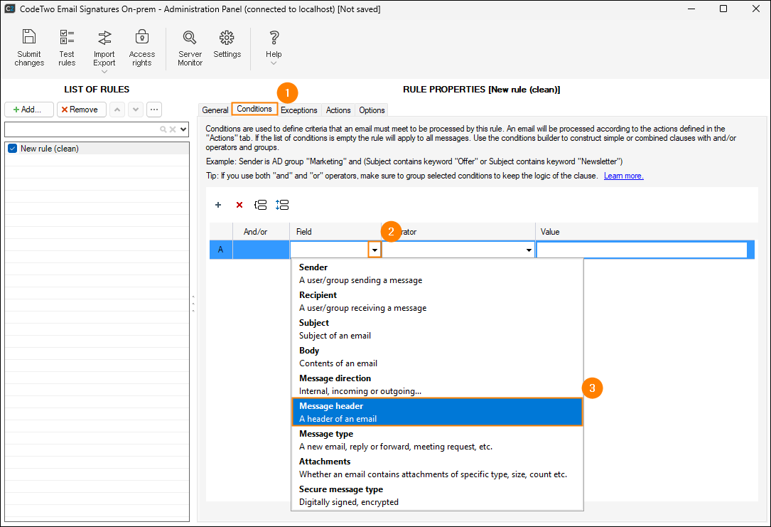 To add the Message header condition, expand the Field context menu within the Conditions tab and choose Message header (Fig. 1.).
