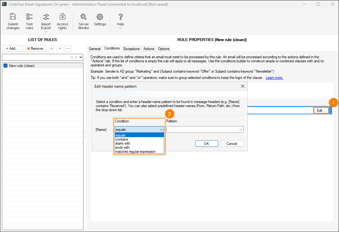 - equals – to meet this condition, header names need to meet the exact text pattern you provide in the Pattern text field next.