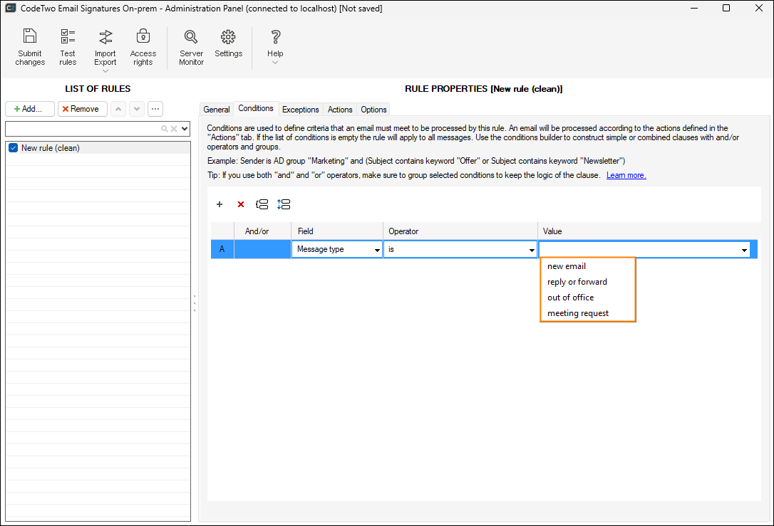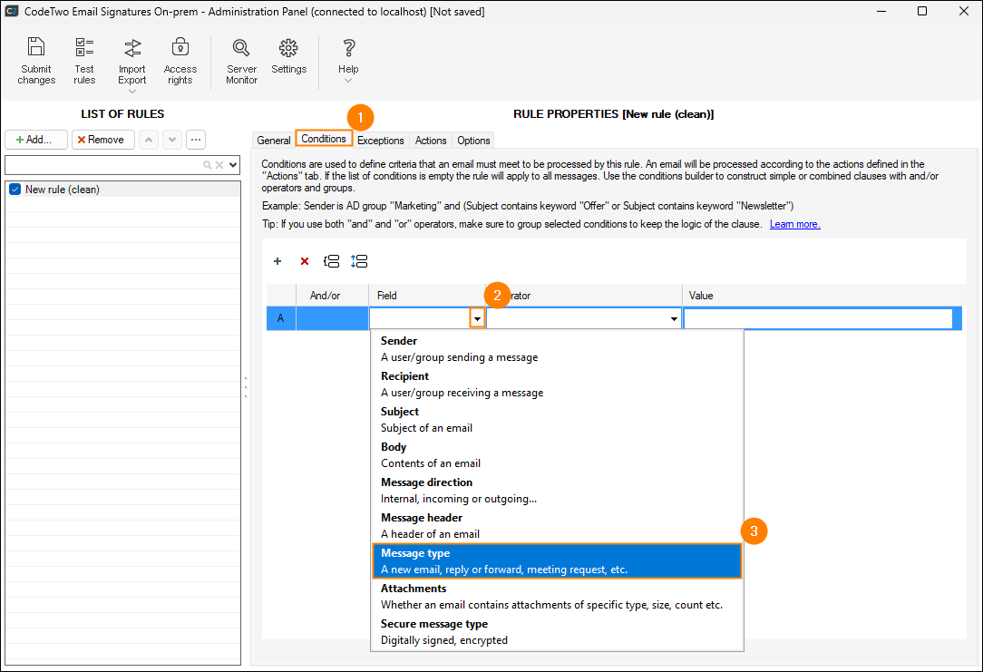 To define the message type, expand the Field context menu within the Conditions tab and choose Message type (Fig. 1.).