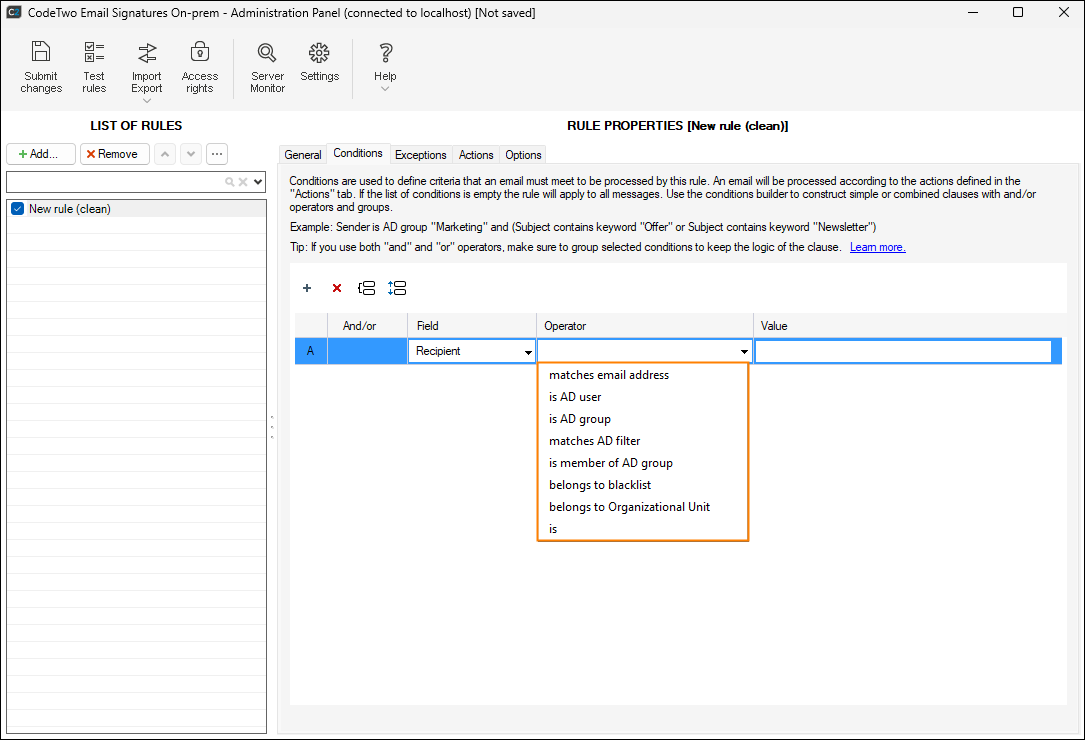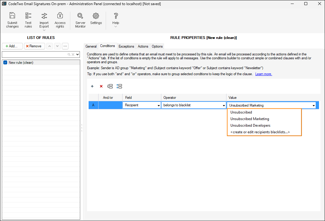 The blacklist containers are managed using the Recipients blacklists tab accessible from Settings in the Administration Panel's ribbon. Note that this condition will be useful only with the Insert signature or Insert disclaimer actions. Furthermore, to ensure that the chosen recipients are unsubscribed from the mailing lists, apart from configuring the rule with the aforementioned actions and conditions, you will also have to create an additional rule with the Block message action. Only the combination of such rules will protect recipients against unwanted messages reaching their mailboxes.
