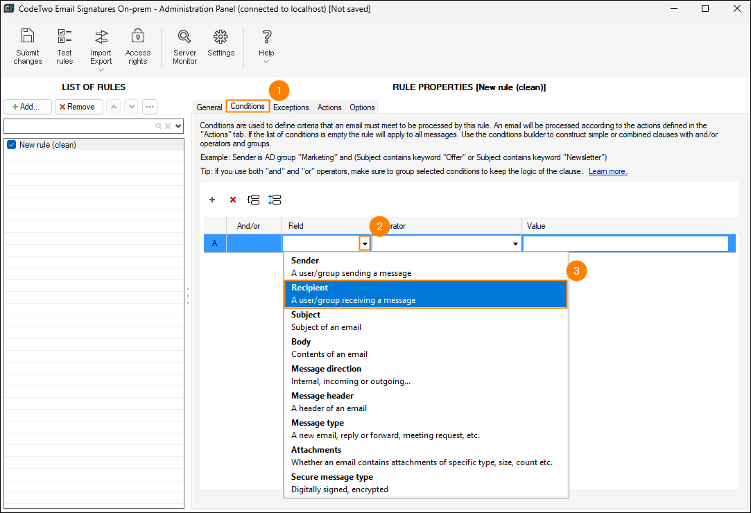 To define the scope of recipients within the Conditions tab, expand the Field's context menu and choose Recipient (Fig. 1.).