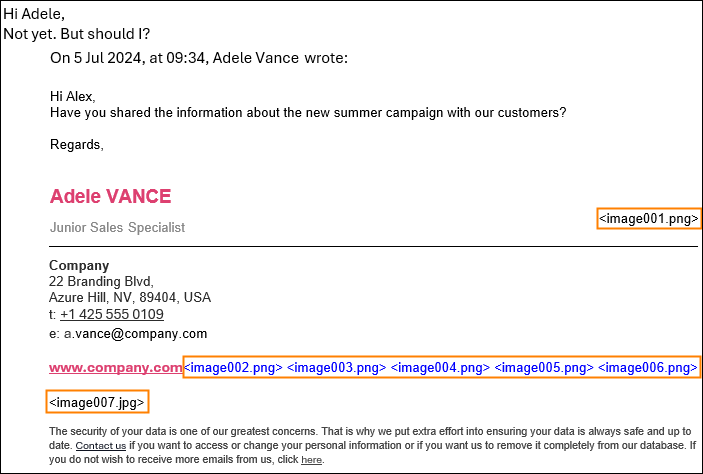 By default, iPhones and iPads remove images (e.g. pictures embedded in email signatures) from email correspondence when a user hits the Reply button. To be specific, when a user replies, images in a conversation disappear and get replaced with <image_filename.extension> text fields (e.g. <image001.jpg>), as shown in Fig. 1.