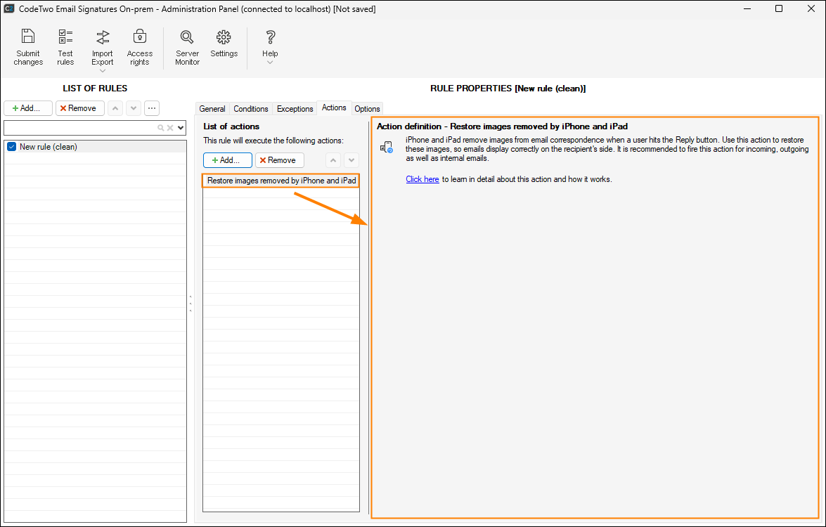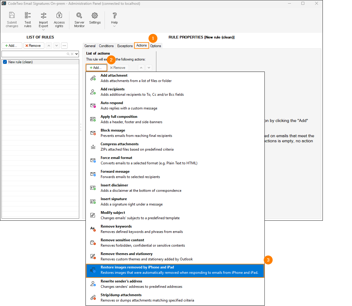 To activate this action, open your email rule in the Administration Panel and move to the Actions tab. Click Add and select Restore images removed by iPhone and iPad (Fig. 2.).