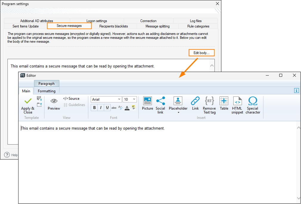 As some of the actions set in rules can only be executed on the envelope messages created by the program while processing secure messages, you can also adjust their body using the dedicated feature in the program's settings (Fig. 2.).