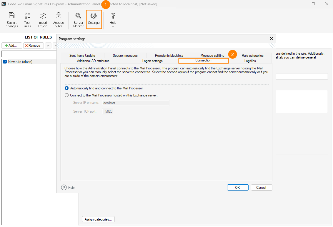 As CodeTwo Email Signatures On-prem can be operated via the Administration Panels installed either in domain or non-domain environments, the program lets you define the most efficient way for the Administration Panel to connect to the CodeTwo Mail Processor (Fig. 1.).