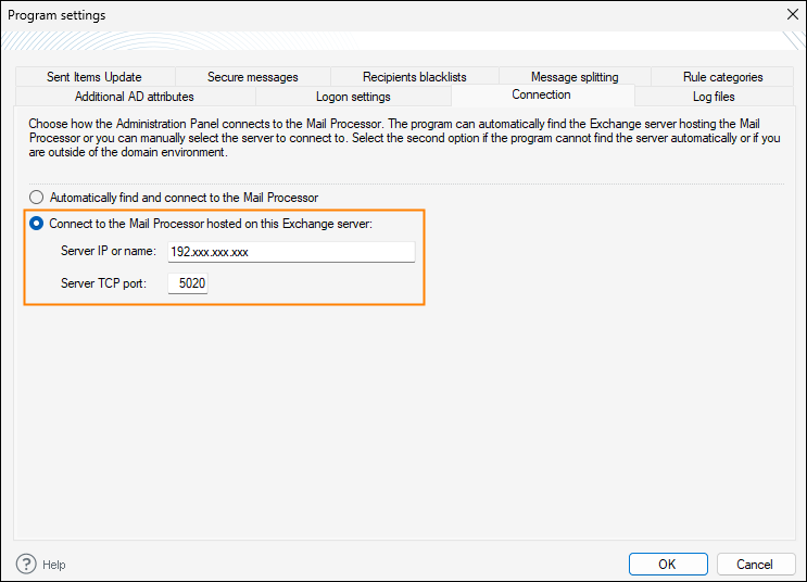 To set up the manual connection, mark the Connect to the Mail Processor hosted on this Exchange Server radio button, enter the Server's IP address or name and then define the Server's TCP port (Fig. 2.). To save changes, click OK.