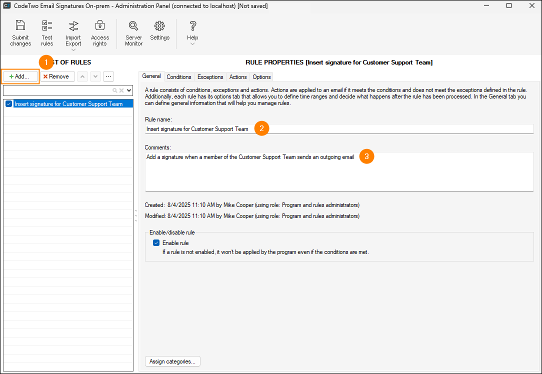 Add a new rule to the list of rules using the Add button. Name the rule and describe it (Fig. 1.).