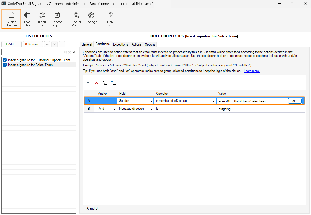 Last but not least, we have to modify the conditions prior to submitting the changes. Open the Conditions tab of your second rule and change the value of Sender is member of AD group to the other group, e.g., Sales Team (Fig. 7.).