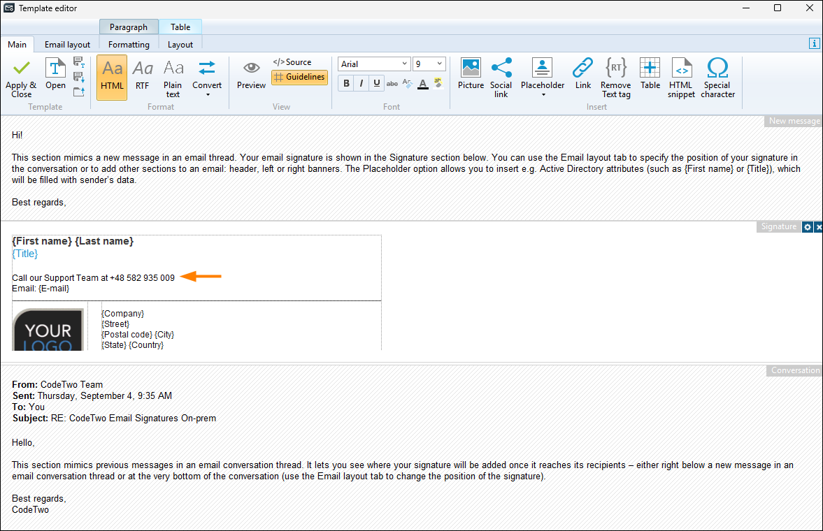 Let us say the signature of your employees working in Customer Support Team should only contain a general phone number that is common for the entire department. On the other hand, people who work in the Sales Team (dedicated to handle the cases of the most important customers) might want to include their direct number. Still, the signature layout must remain similar to keep a professional look of the correspondence.