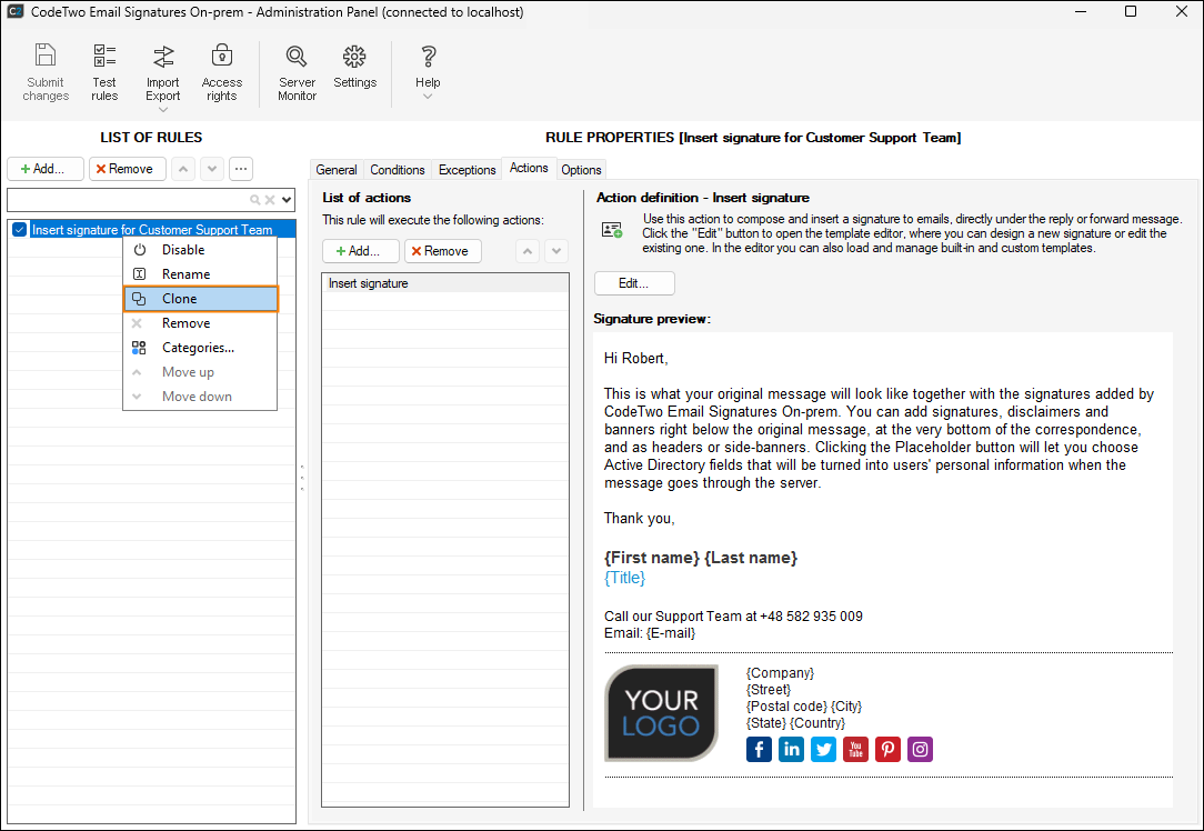 CodeTwo Email Signatures On-prem allows you to quickly and easily adjust email signatures so that they are suitable for different departments – the program contains a feature that lets you clone signature rules.