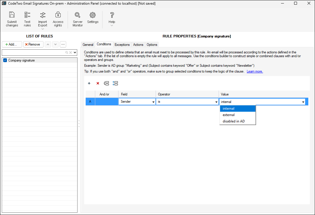 - Switch to the Conditions tab and select conditions that should trigger the rule. Usually, you would need to select the scope of senders to whom this rule will apply, e.g. all internal senders (as shown in Fig. 2.) or only selected Active Directory users. The program lets you also select different conditions, such as keywords in messages, specific email content, message direction, message header, and so on. Learn more about conditions