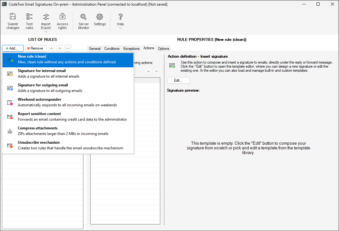 - Run the Administration Panel of CodeTwo Email Signatures On-prem and create a new rule by clicking Add and selecting New rule (clean) in the List of rules pane.