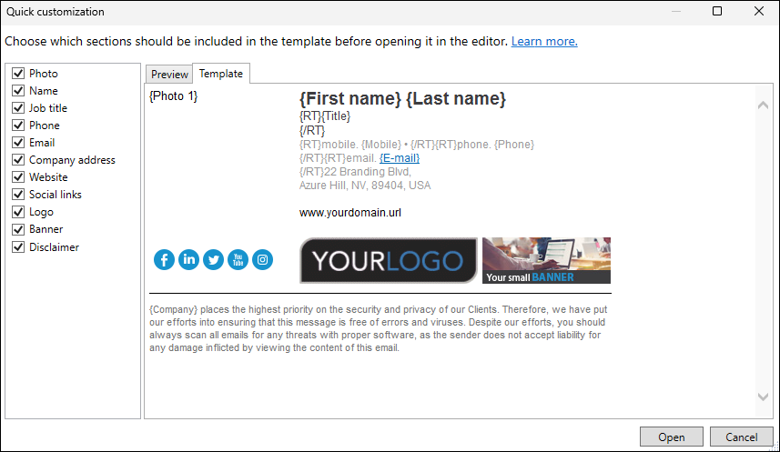 However, if you have to use large user photos, you need to adjust the {Photo} placeholder properties before using these photos in your email signatures. Otherwise, the large photographs will not fit into your signature template. Learn more