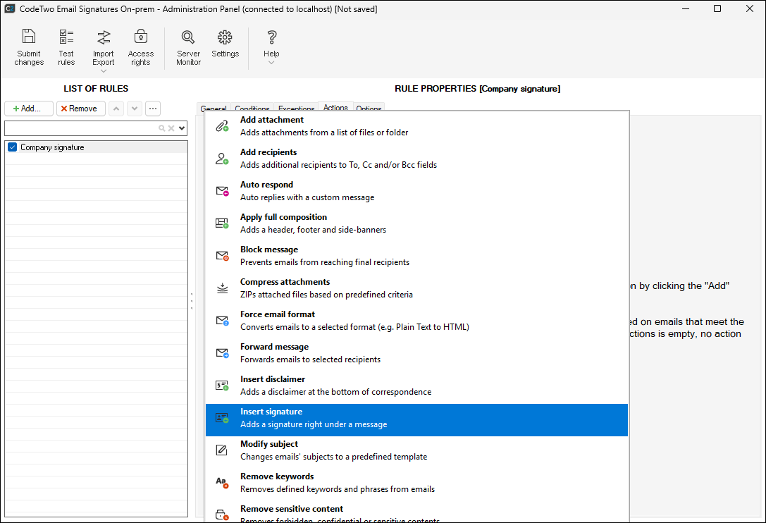- Switch to the Actions tab. Click Add in the List of actions section and choose Insert signature from the drop-down menu (Fig. 3.). Selecting this action lets you easily compose an Exchange email signature in the program.