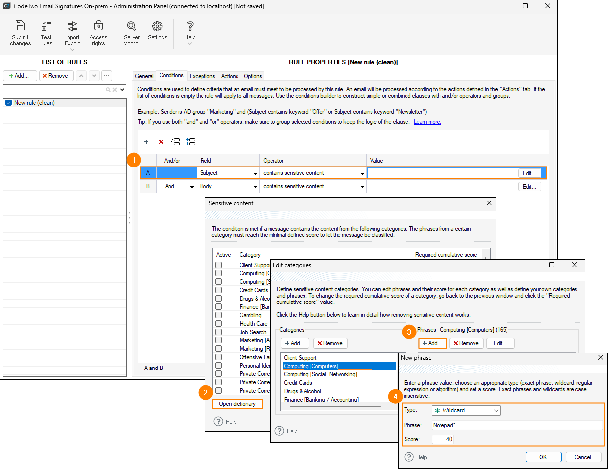 To define wildcards for phrases in the Subject or Body conditions, add these conditions to a rule, choose the contains sensitive content operator and click Edit. Next, in the Sensitive content configuration window, mark any category (dictionary) and click Open dictionary. In the Edit categories window, click Add on the right side, under Phrases. In the New phrase editor, choose Wildcard from the Type drop-down menu and add a string of characters preceded or followed by an asterisk (Fig. 1.).