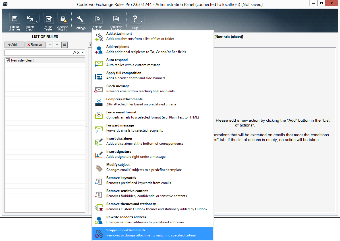 The Strip/dump attachments action in CodeTwo Exchange Rules Pro is used to automatically remove certain attachments and to dump (copy) them from messages onto a hard drive. This feature lets the administrators make sure that unwanted attachments are removed from messages before they reach their recipients. Moreover, mailboxes can be significantly slimmed down as attachments are saved to a hard drive.