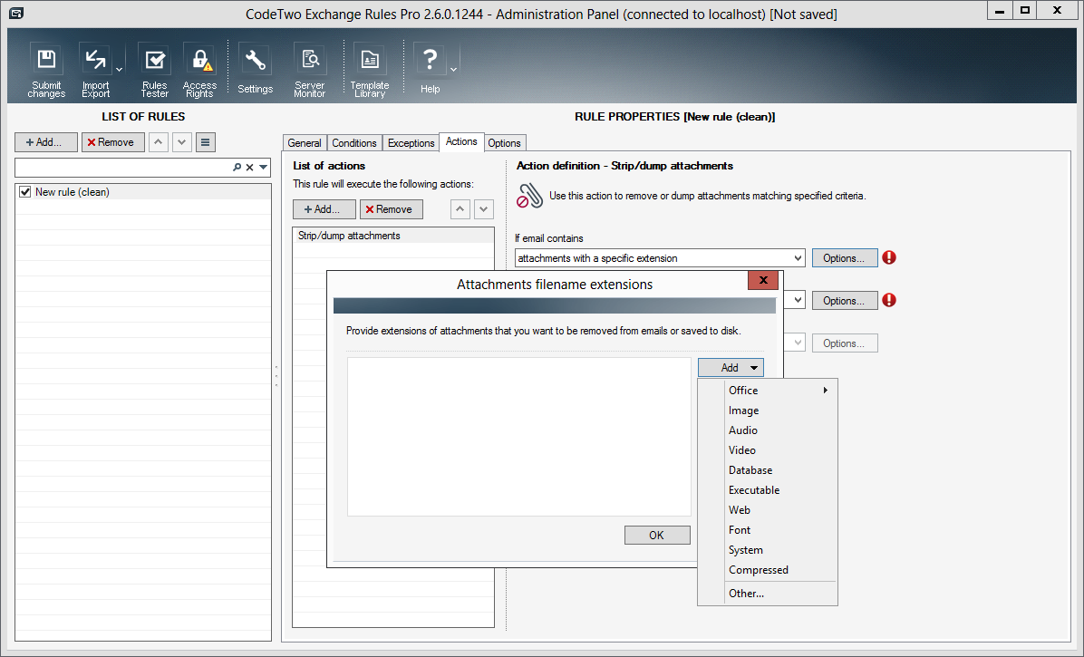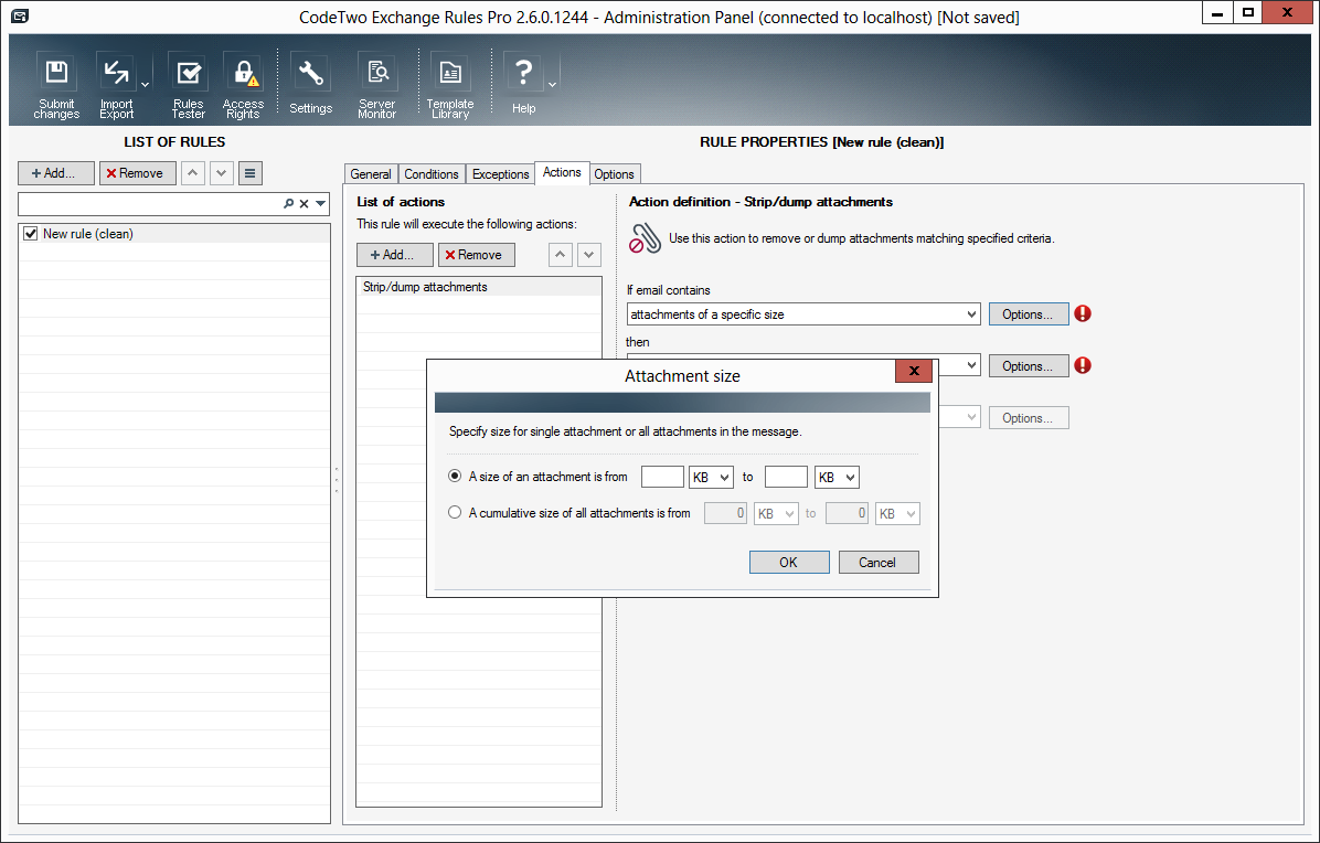If you do not control the flow of attachments in your organization, the users may send large files via internal mail instead of making them available in a shared location; they might even send sensitive information in attachments. CodeTwo Exchange Rules Pro will monitor emails in your organization in case the attachments are used in an incorrect way. If you activate the Strip/dump attachments action in a given rule, the program will automatically strip and/or dump attachments that meet the criteria defined in Conditions.